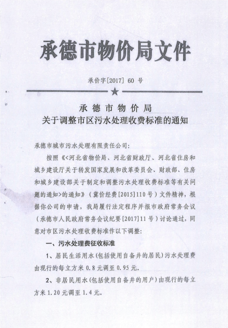 《承德市物價局關(guān)于調(diào)整市區(qū)污水處理收費標(biāo)準(zhǔn)的通知》承價字【2017】60號